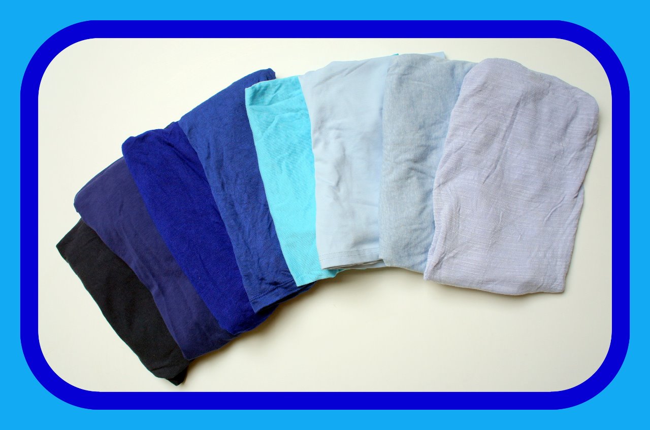 Ci-dessous, voici un échantillon issu des couleurs de mes vêtements, le bleu est très présent... Je suis néanmoins perplexe que ma couleur préférée soit le bleu alors qu'il s'agit d'une couleur froide et que d'après la colorimétrie je suis une femme de type printemps qui doit porter des tons chauds... Si la colorimétrie vous intéresse voilà un bon blog sur ce sujet jeanneregnier.canalblog.com/archives/2012/03/17/23783370.html